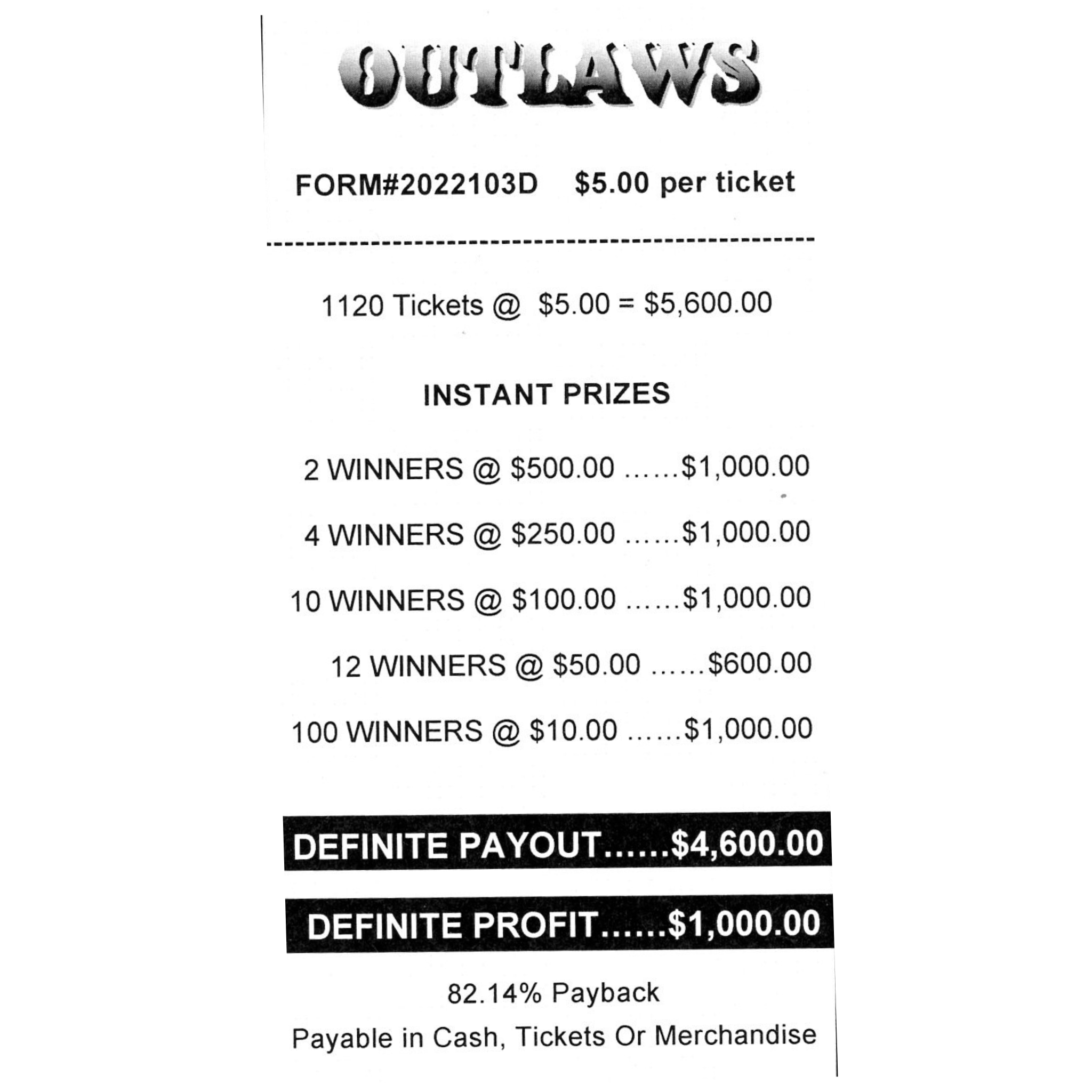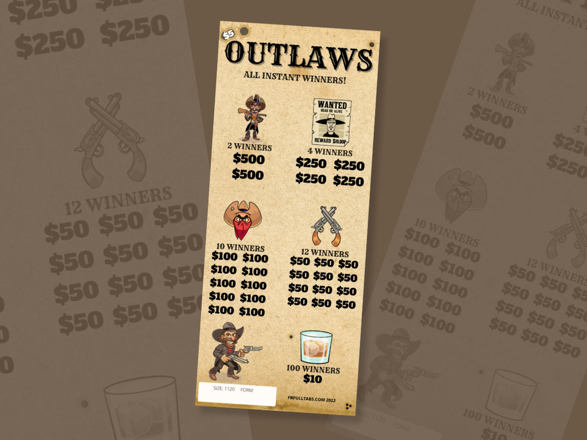 This Outlaws game is a one-window pull tab game with 1,120 cards at $5.00 each. There are no signers, holders, or seals. All winners are INSTANT WINNERS!
